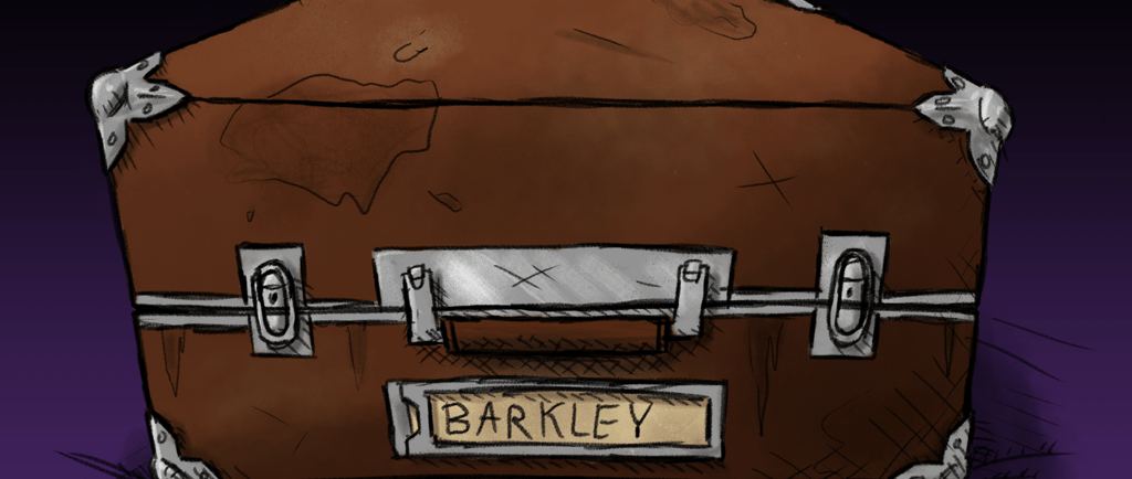 It was a whole lot more like a chest than anything. Some kind of old-timey crap that the kids call vintage. Now, Zeke said his looked exactly like that friggin’ bag ‘cept his had a little tag on it that said ‘BARKLEY'. I asked him if that was his last name, and he said ‘no’ to me like I was stupid or something for even asking.